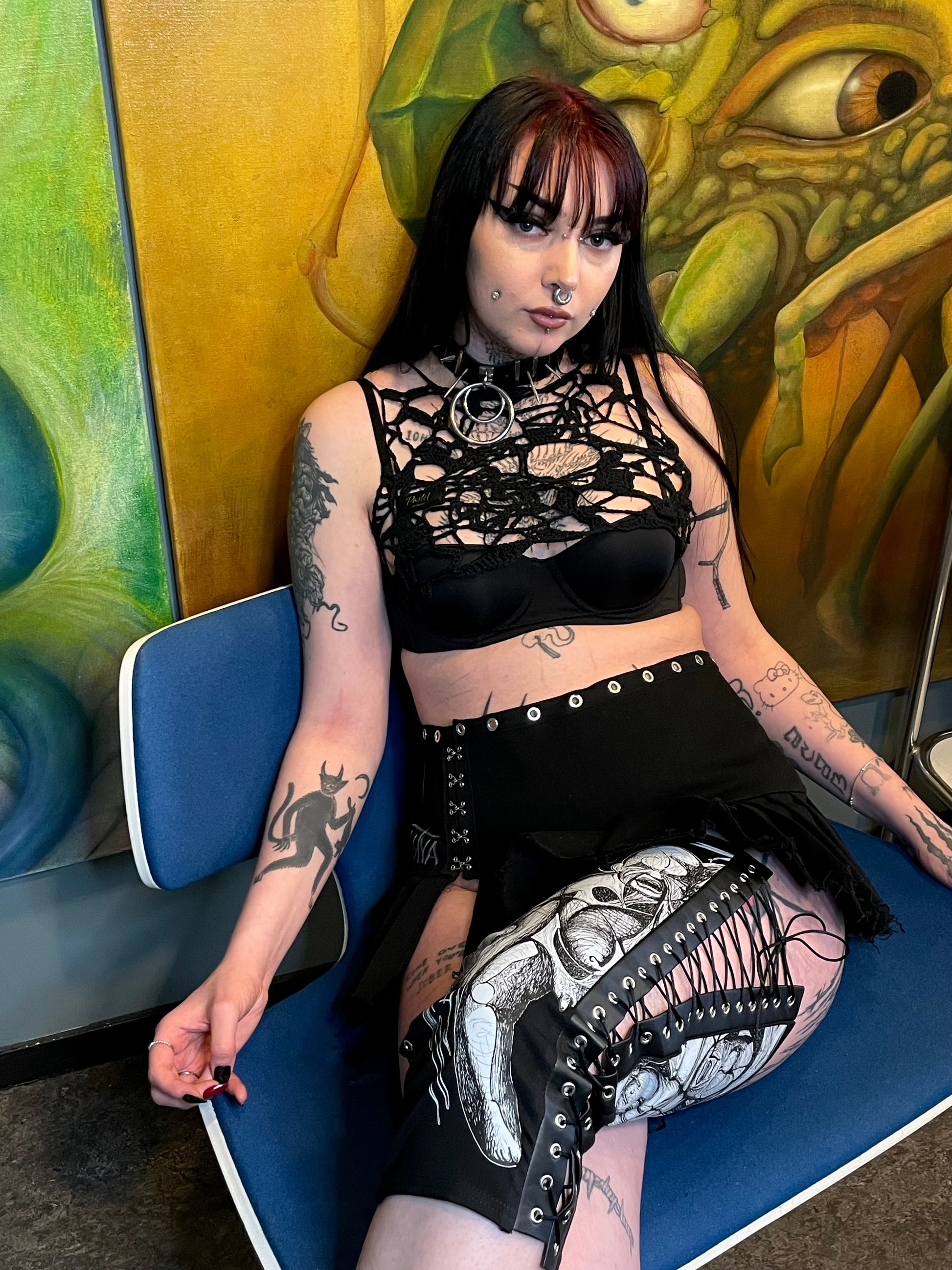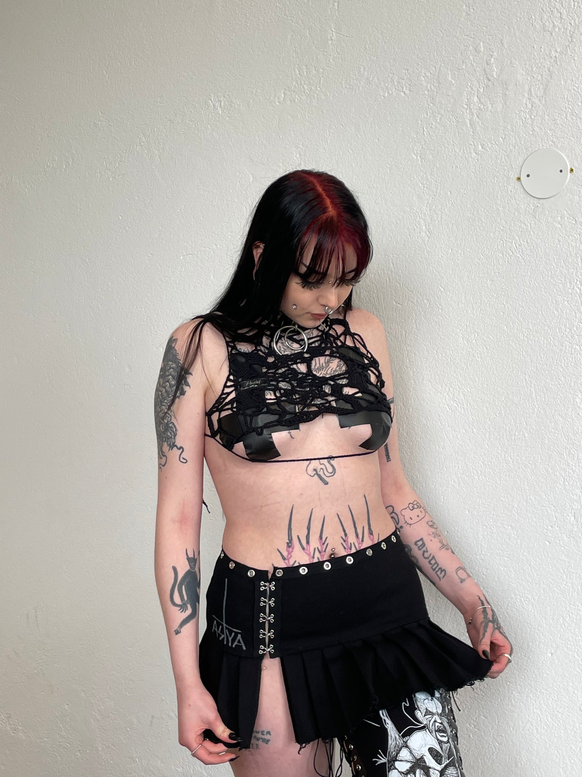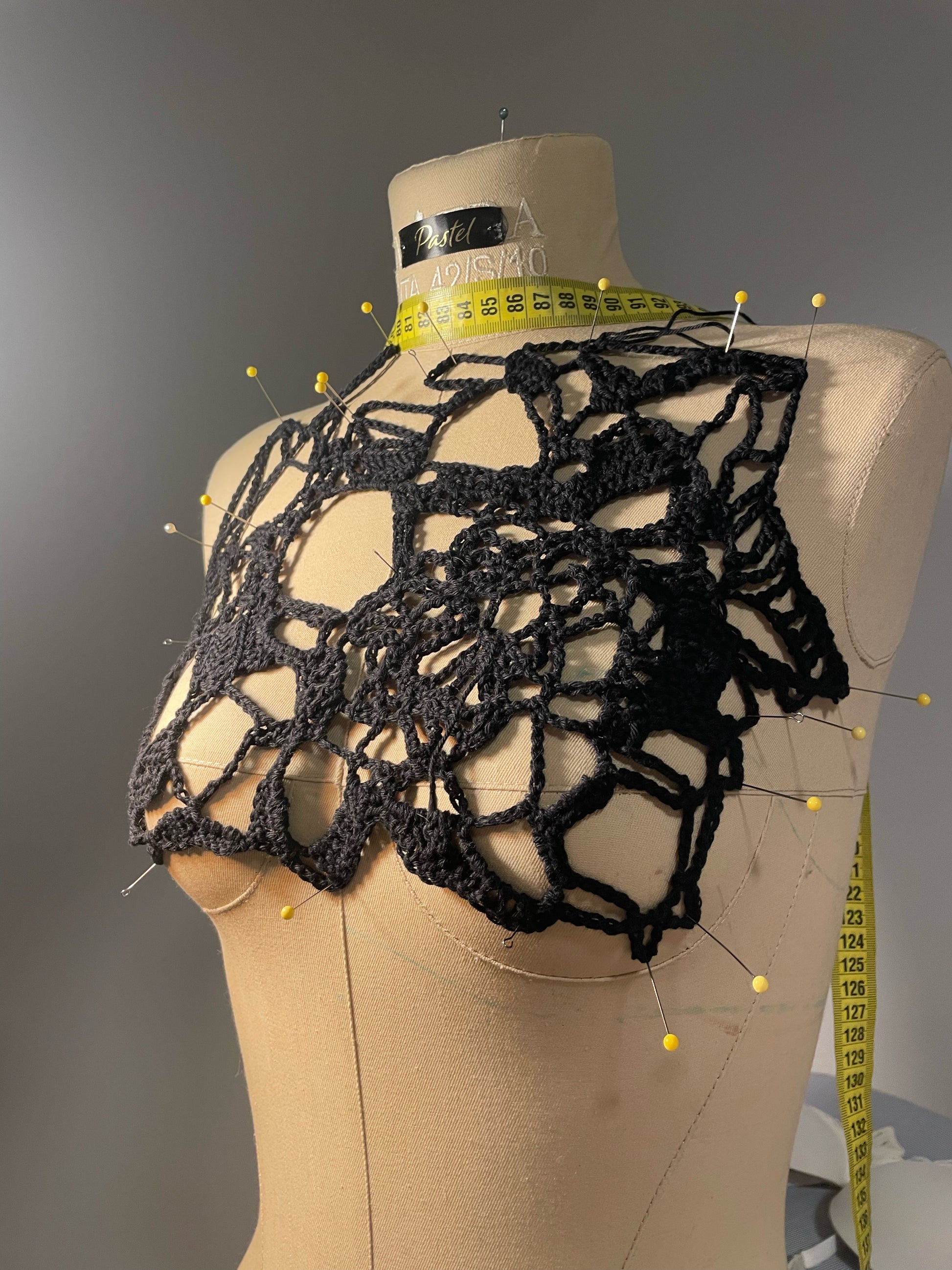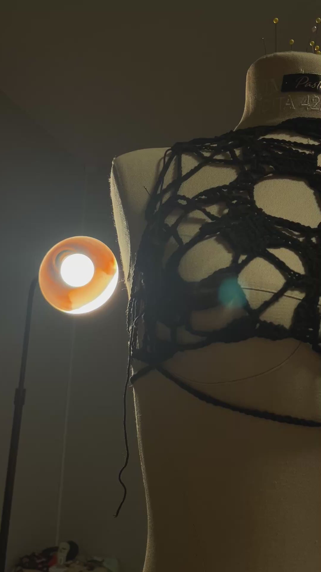 Made using free crochet technique, creating an organic and irregular structure. Lightweight and breathable, with a sculptural yet raw finish.