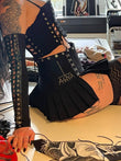 Black low-rise mini skirt designed to sit on the hips with a deconstructed construction language.