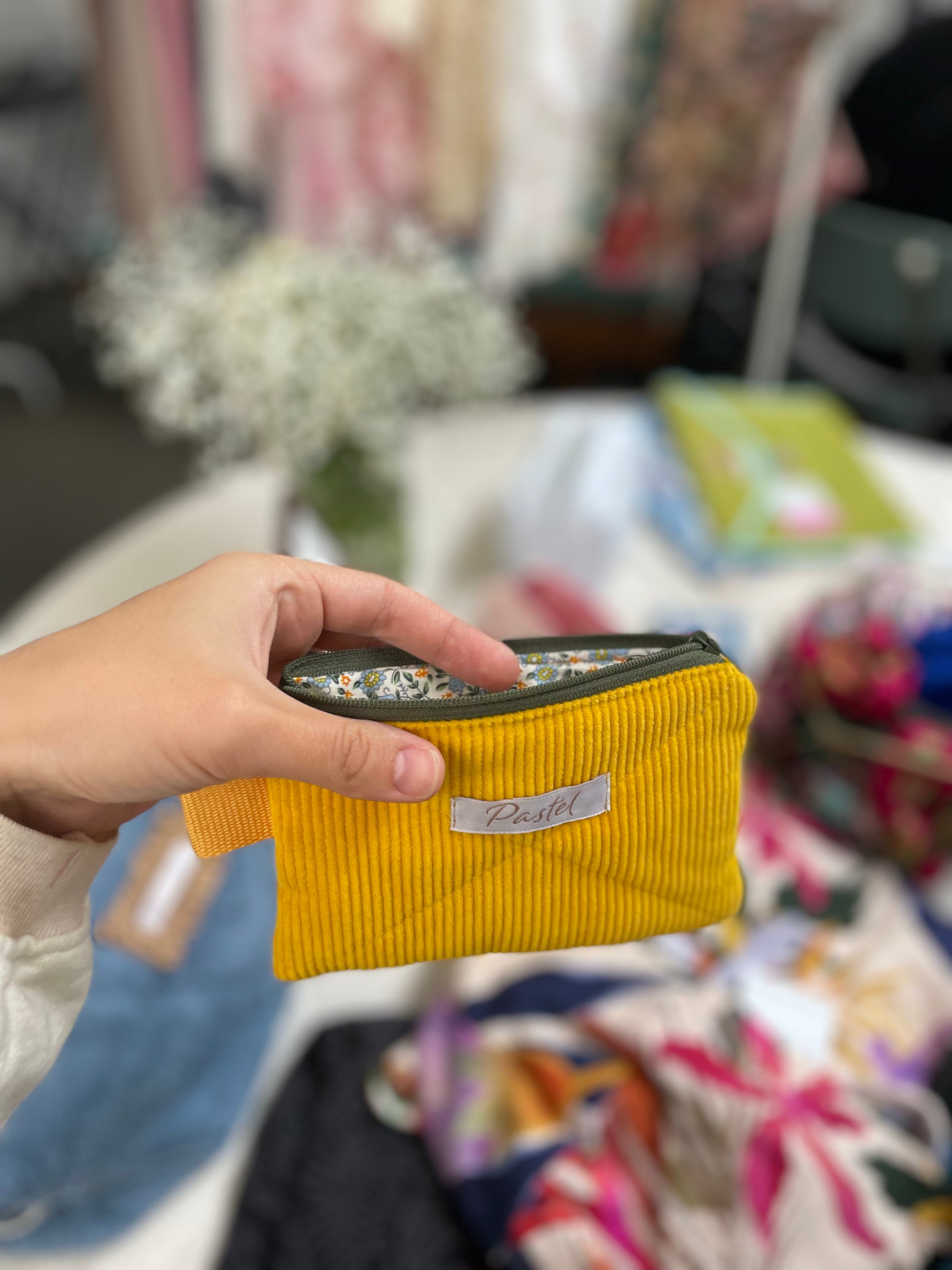 Brighten your day with this playful yellow lipstick bag crafted from soft corduroy. Its cheerful floral lining adds a fun surprise inside, while the sturdy khaki zipper keeps your essentials secure. Perfectly sized for your favorite lipsticks or small beauty must-haves, this bag combines style and practicality with a pop of color.