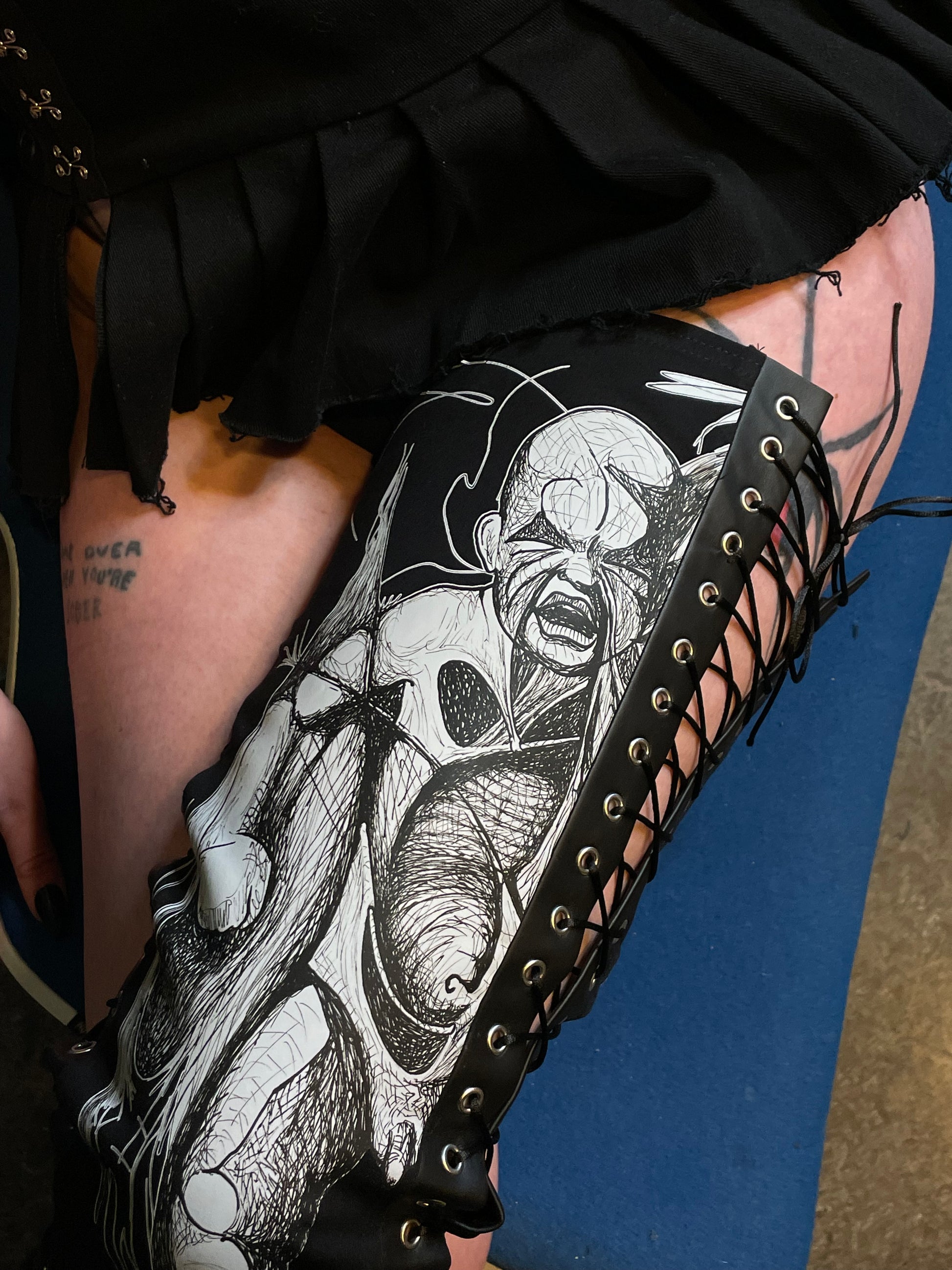 Modular lace-up sleeve designed as a wearable surface for artwork and body extension.