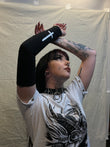 The sleeve is fully adjustable in size (S–adaptable fit) and designed for multiple ways of wearing — as a sleeve or reinterpreted as a leg/hip accessory when laced in pairs.