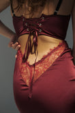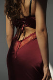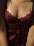 - Rich burgundy satin with delicate lace overlay