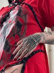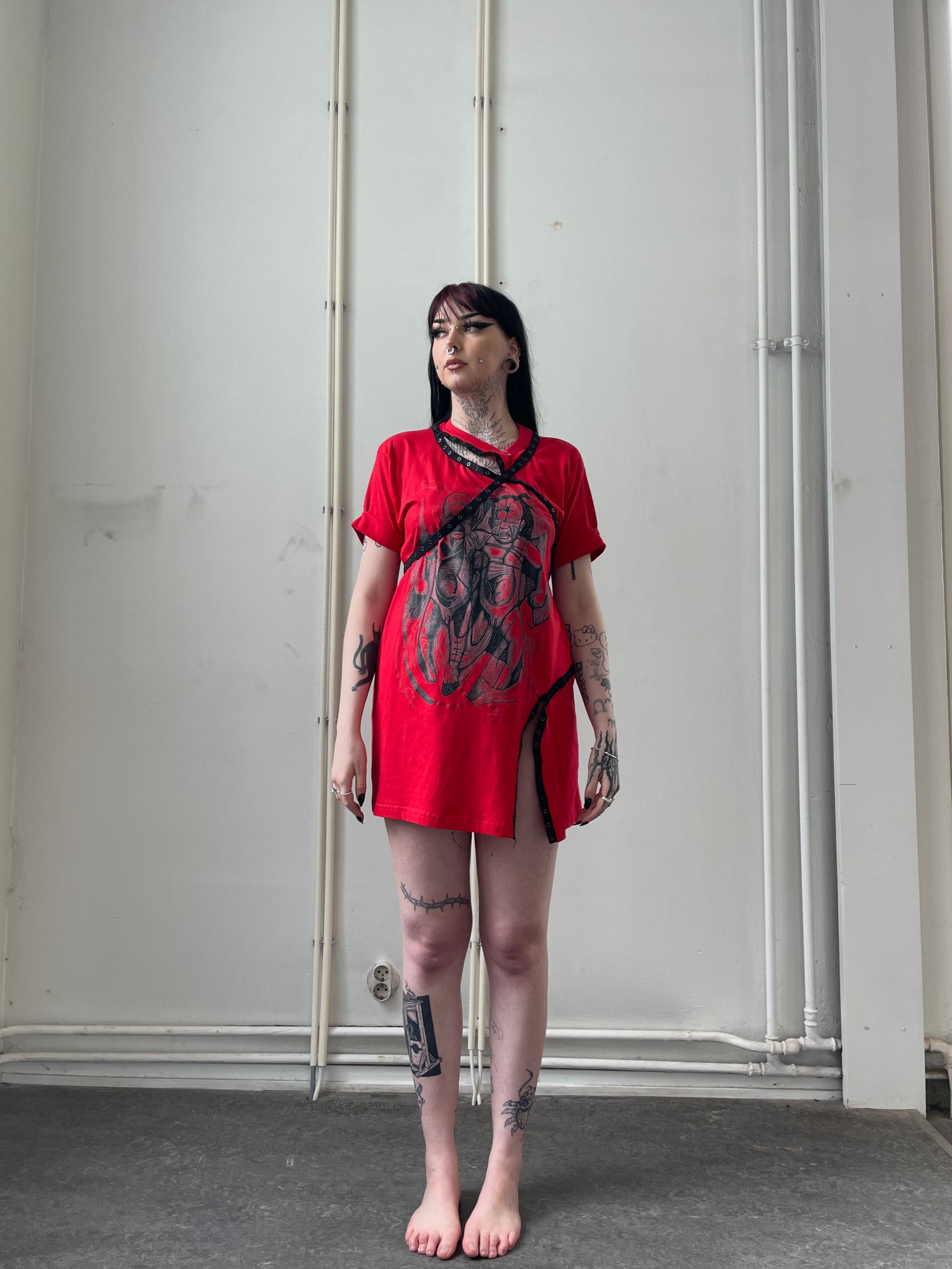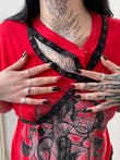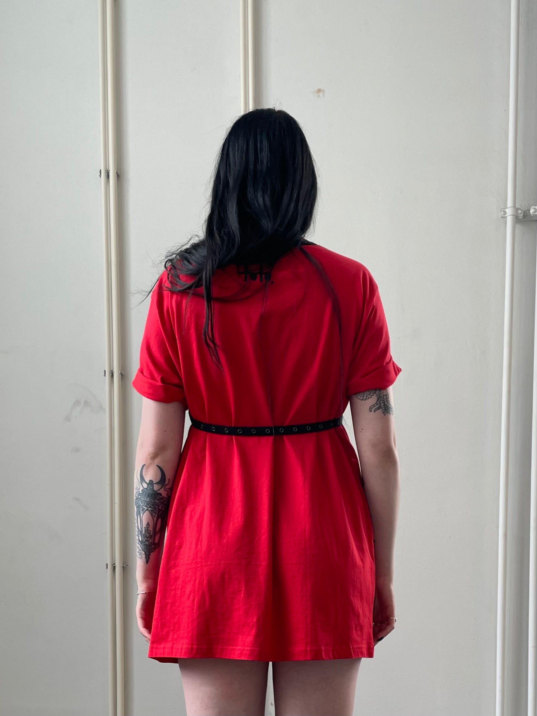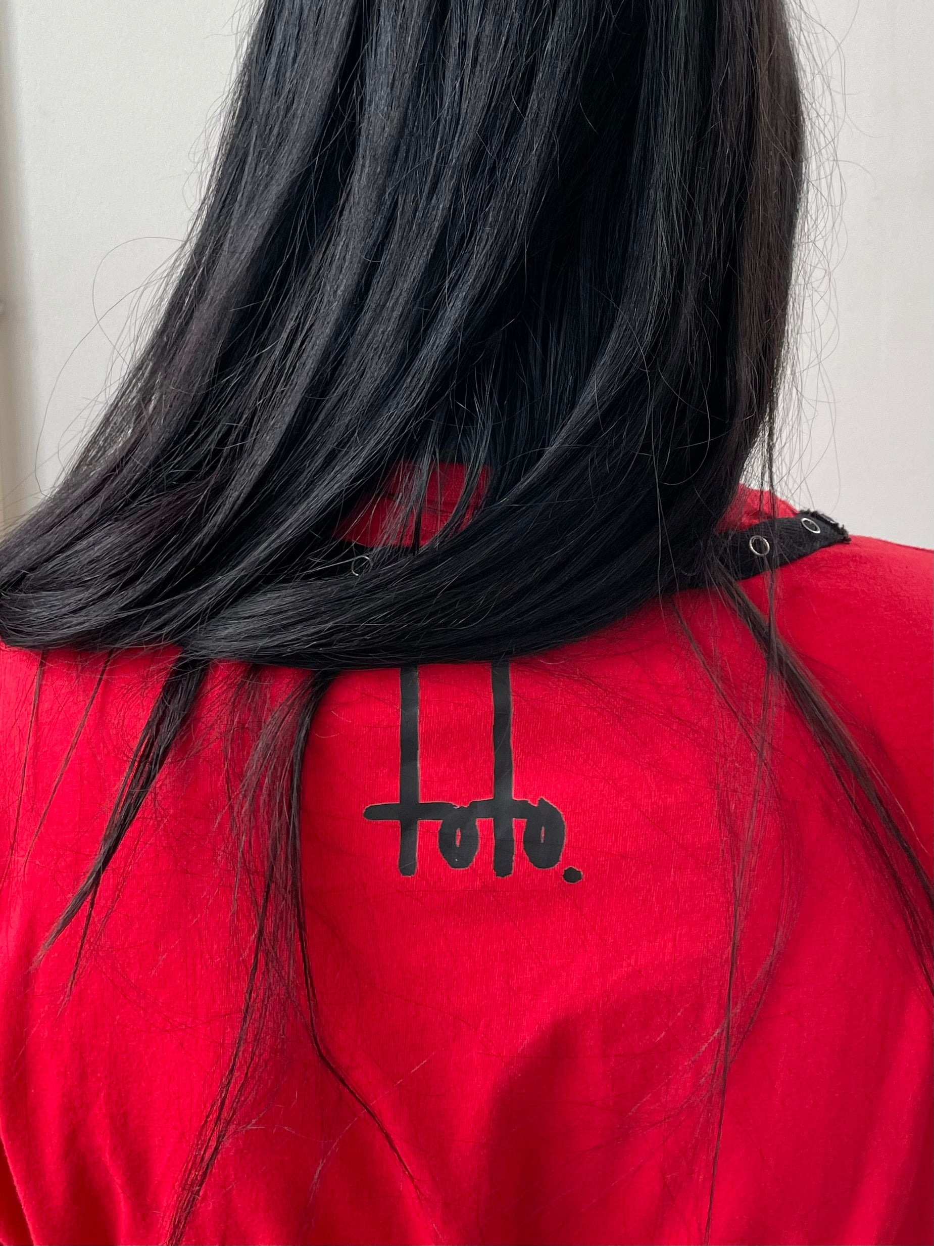 Red extended t-shirt dress featuring a black print by Toto Lara.