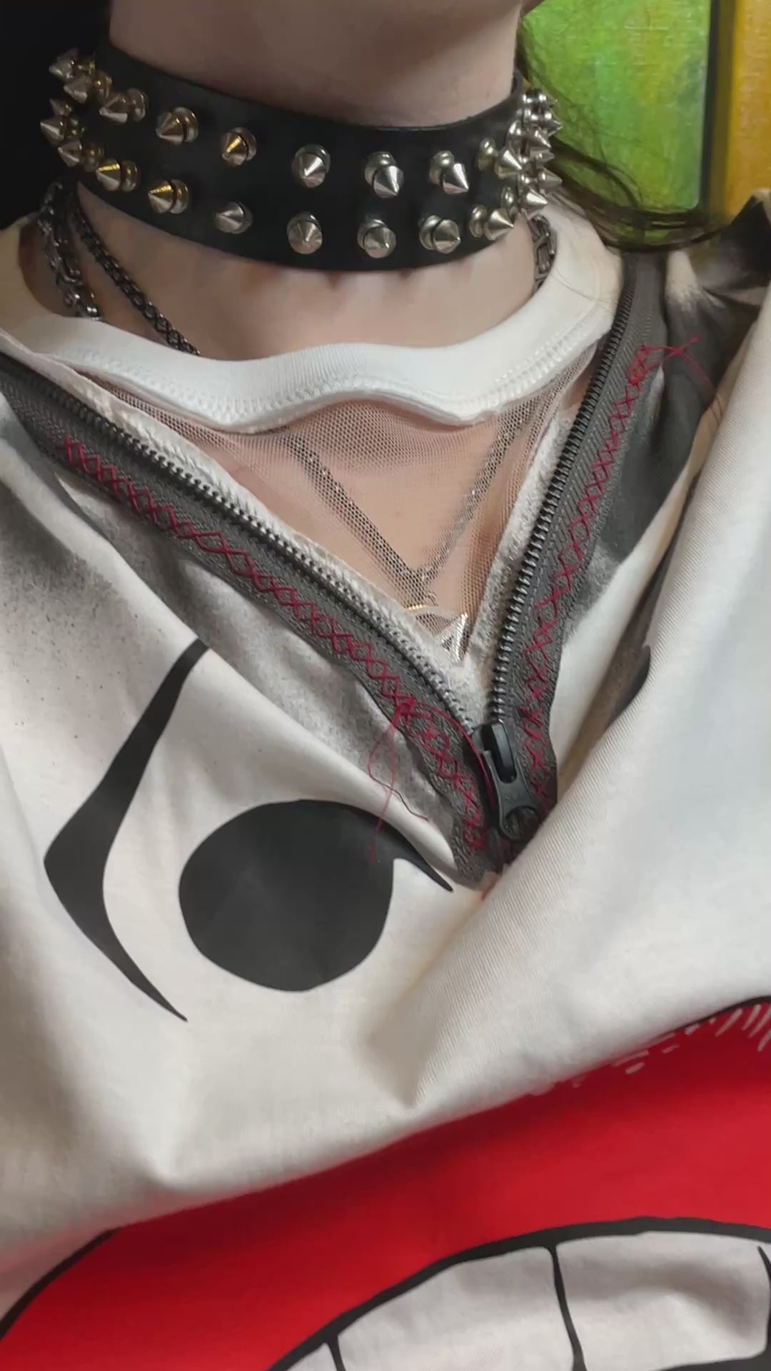 Fabric is cut and reconstructed with semi-transparent mesh. A metal zipper opens the chest area, creating controlled exposure.